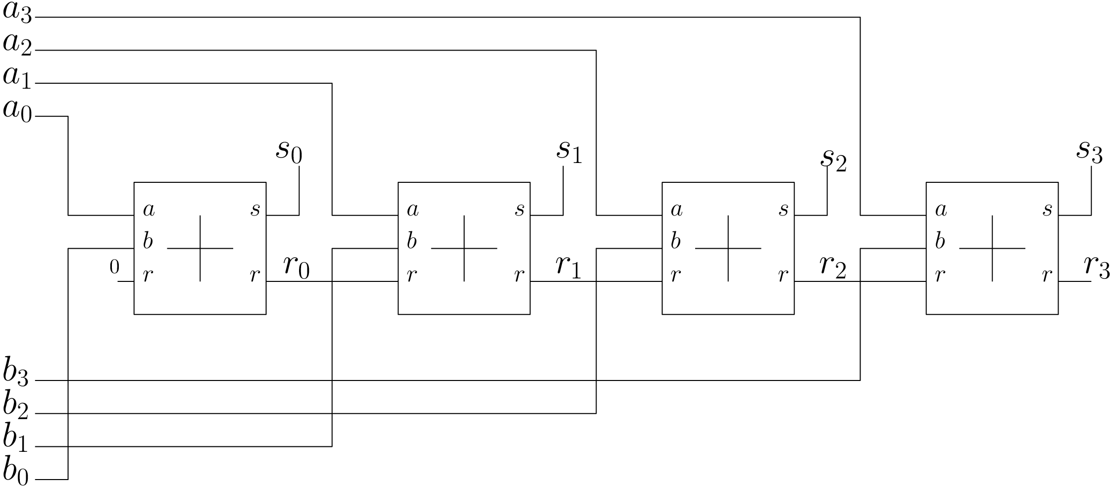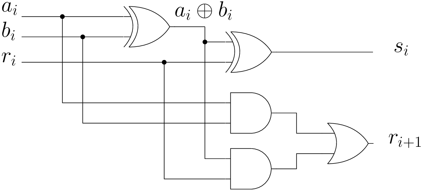 Additionneur complet : \[(a, b, r) \rightarrow (retenue, reste)\]