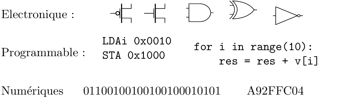 Un bit (0, 1) va être représenté physiquement par un niveau de tension