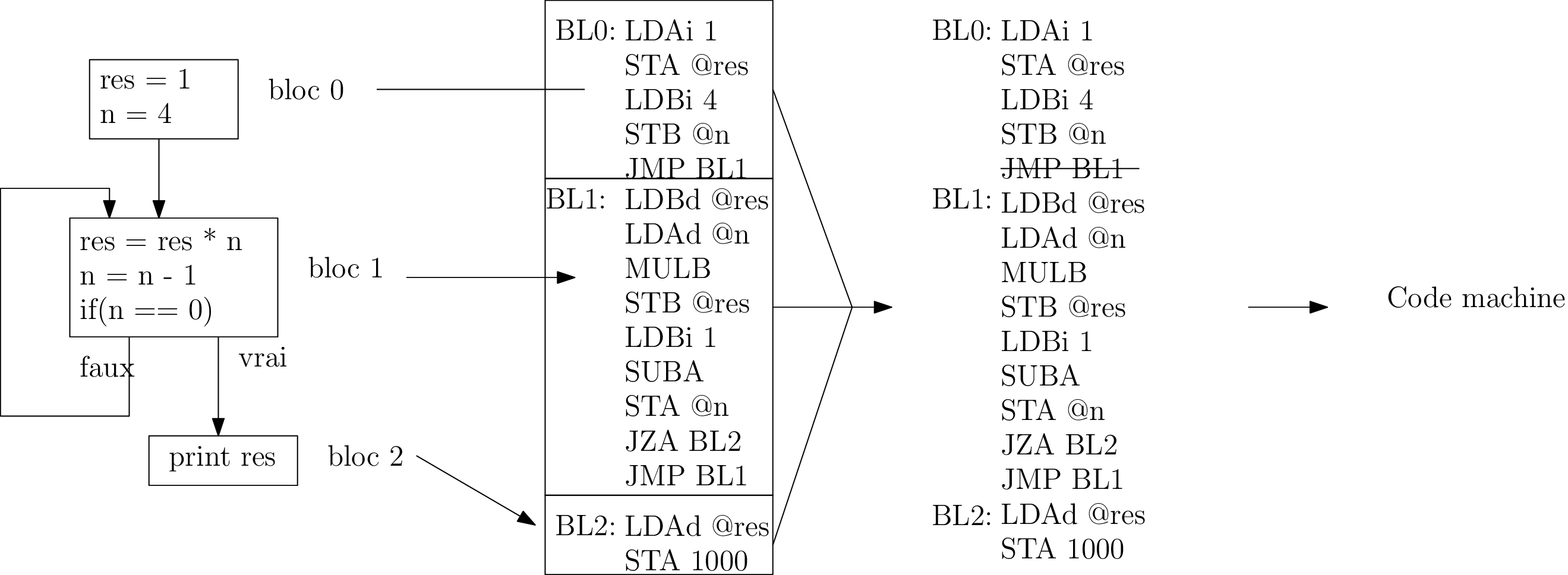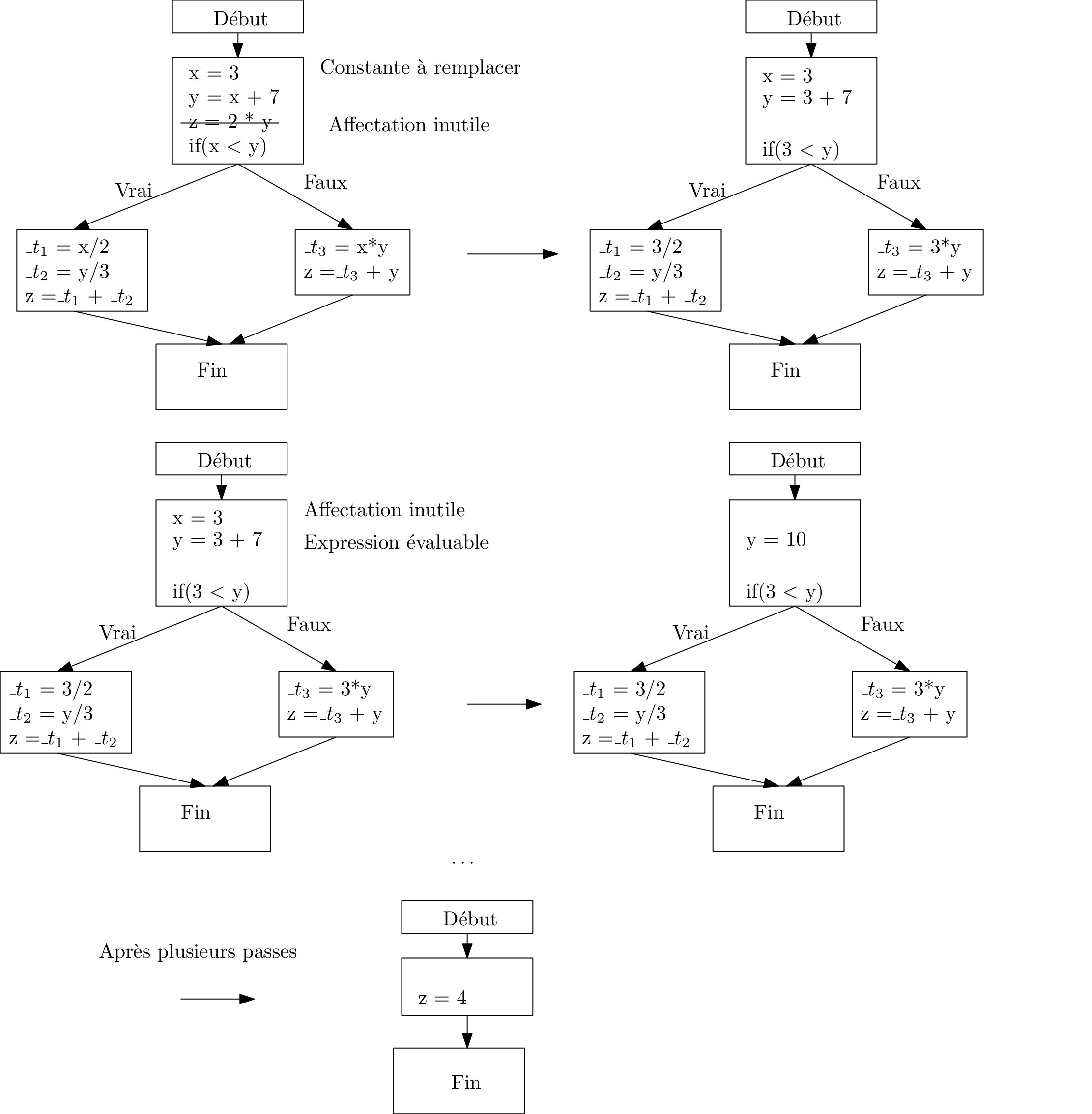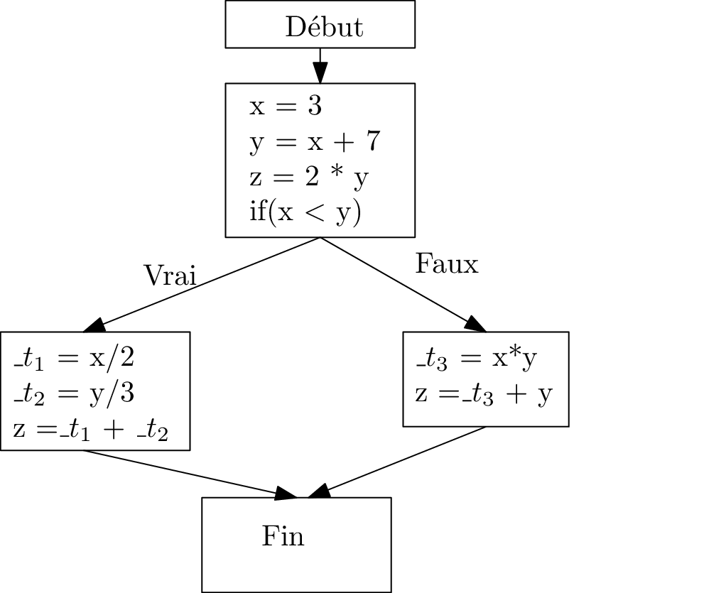 x := y op zx:= op yx := ygoto L; If x relop y goto Lparam x1,.. call p, return yRéférences :
