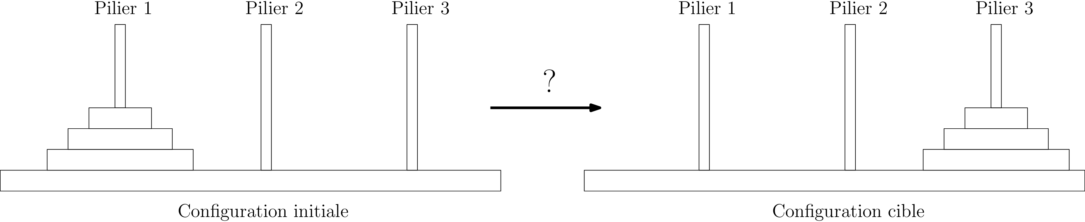 Calculer le nombre de déplacement minimum nécessaires : \[h(n) = \begin{cases} 1 & \mbox{si } n=1 \\ 2h(n-1) + 1 & \mbox{sinon} \end{cases}\] \(h(4) = ?\)