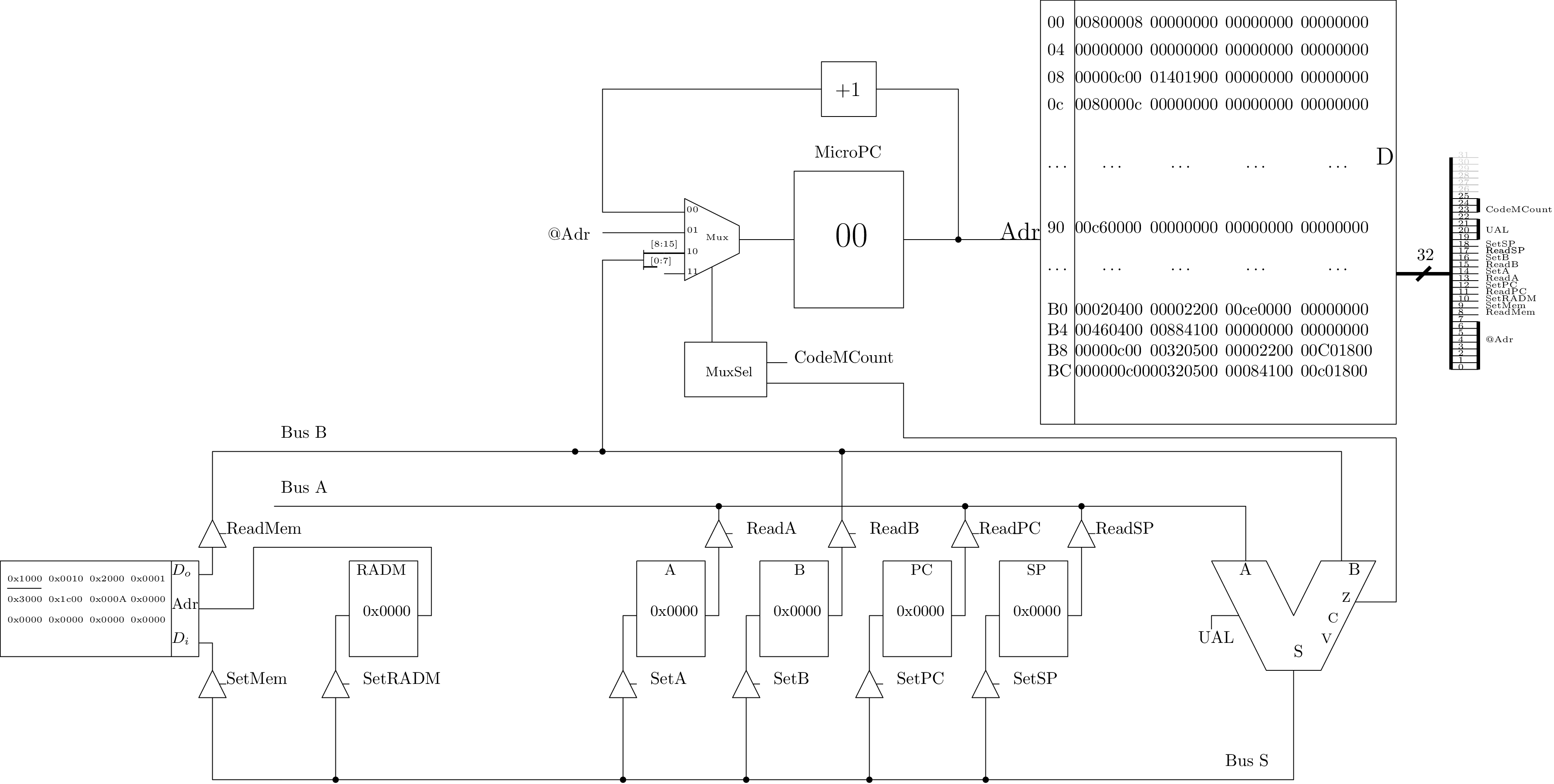 | 0x1400 | LDAd | 2 | Charge la valeur dans la RAM pointée par l’opérande dans le registre A. [A:=Mem[opérande]]. |