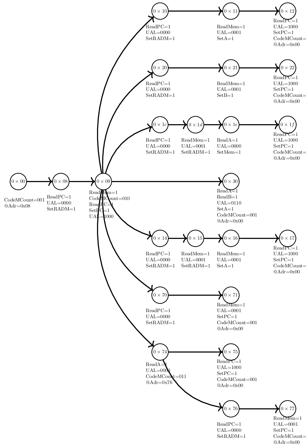 | 0x7400 | JZA | 2 | Saute à l’adresse donnée par l’opérande si le contenu du registre A est nul. [PC:=operande si A=0] |