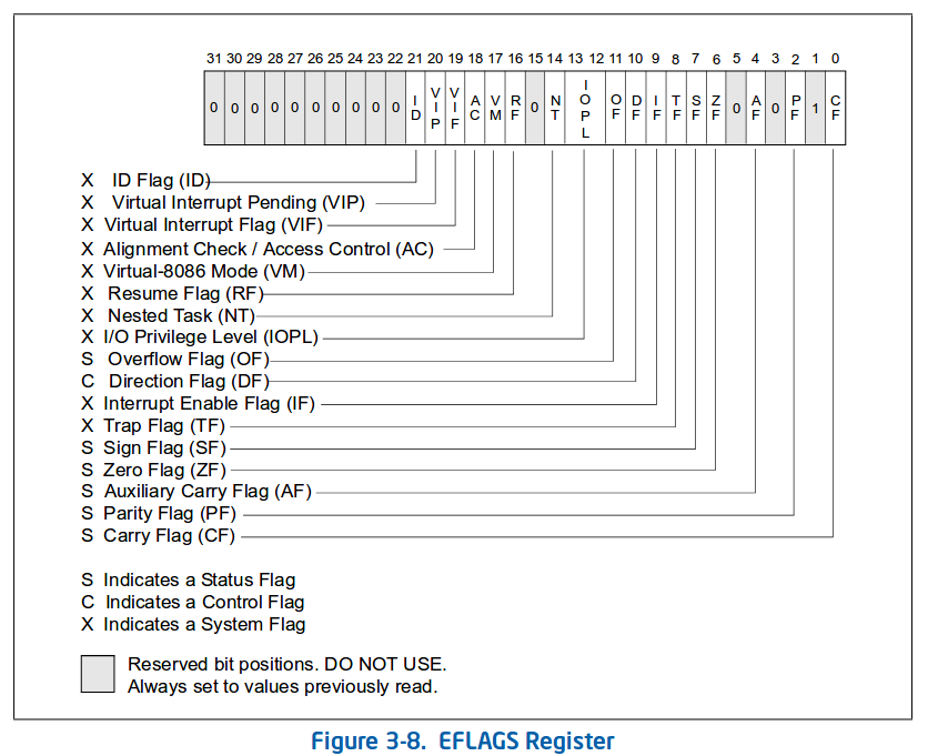 Carry Flag (CF), Sign Flag (SF), Zero Flag (ZF),