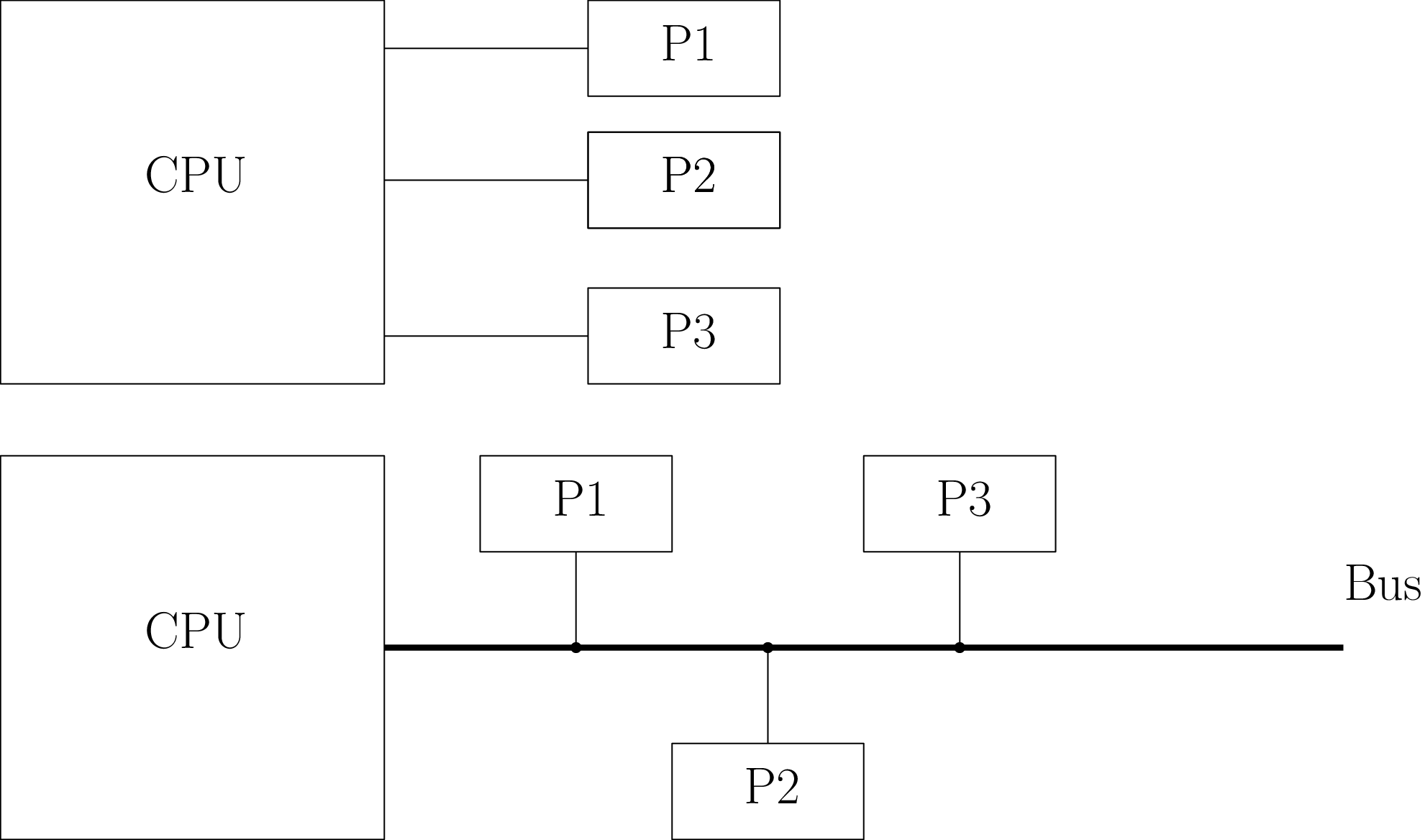Bus parallèles (échange de mots, large mais court) / Bus série (bit à bit, e.g. USB)