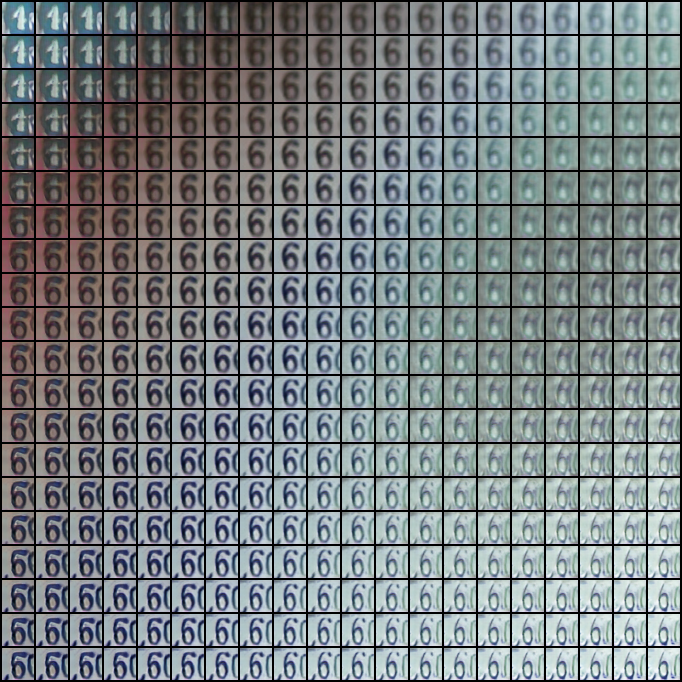 You could even go further and consider three latent vectors \(z_1\), \(z_2\) and \(z_3\). From there, we can define a basis with the origin \(z_1\) and two vectors \(\vec{v}_1 = z_2 - z_1\) and \(\vec{v}_2 = z_3 - z_1\). Finally, considering two weights \(\alpha, \beta \in [0, 1]^2\), we can generate images as \(G(z_1 + \alpha \vec{v}_1 + \beta \vec{v}_2)\).